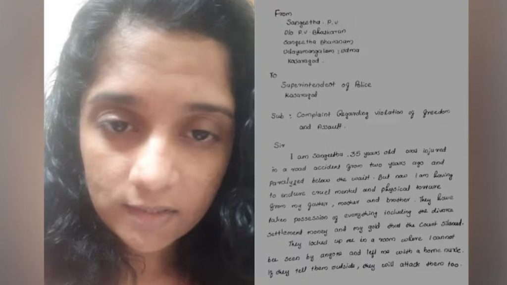 വാഹനാപകടത്തിൽ പരിക്കേറ്റ് അരയ്ക്ക് താഴെ തളർന്ന വ്യക്തിയാണ് സംഗീത. വീട്ടിൽ കടുത്ത ദുരിതമാണ് അനുഭവിക്കുന്നതെന്നും തടങ്കലിൽ പാർപ്പിച്ചിരിക്കുന്ന തനിക്ക് ചികിത്സ നിഷേധിക്കുകയാണെന്നും സംഗീത വീഡിയോയിൽ പറയുന്നു. സ്വത്ത് തട്ടിയെടുത്ത കുടുംബം തന്നെ ആത്മഹത്യയിലേക്ക് പ്രേരിപ്പിക്കുകയാണെന്നും അവർ ആരോപിച്ചു. തനിക്ക് ലഭിച്ച വിവാഹമോചന സെറ്റിൽമെന്റ് തുക മുഴുവൻ പിതാവും സഹോദരനും ചേർന്ന് കൈക്കലാക്കിയെന്നും, അതിനുശേഷം കൃത്യമായ ചികിത്സപോലും ലഭിക്കുന്നില്ലെന്നും സംഗീത പറയുന്നു.