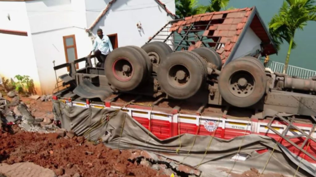 കോഴിക്കോട് ഫറോക്കിൽ റോഡ് ഇടിഞ്ഞ്, റോഡരികിൽ പാർക്ക് ചെയ്തിരുന്ന സിമന്റ് ലോറി വീടിന് മുകളിലേക്ക് മറിഞ്ഞു